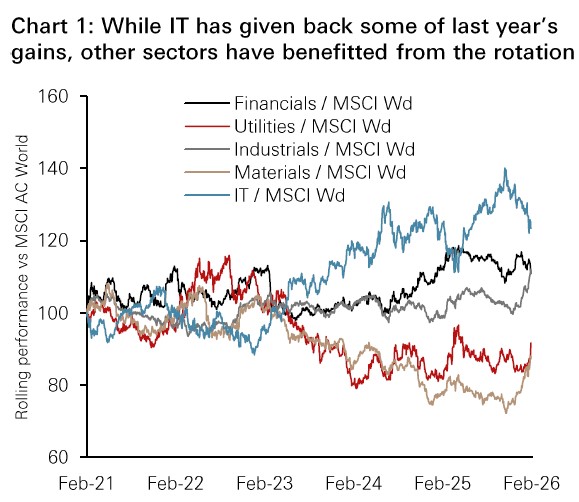• The recent market sell-off was triggered by concerns that incumbent software companies could be replaced by AI start-ups. We believe these fears are  exaggerated, as these companies are also well positioned to benefit from AI for greater efficiency. The investor rotation from IT to other sectors broadens opportunities in industrials, materials and utilities. A multi-asset solution will help diversify across asset classes, sectors, markets and currencies.