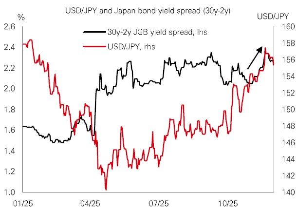 Japanese policymakers face a trilemma – balancing a desire for fiscal stimulus and accommodative monetary policy while avoiding yen weakness. Any two are achievable – but at the cost of the third. Under the newly-elected PM Sanae Takaichi, the government has recently passed a sizeable fiscal stimulus package (estimated at around 3% of GDP). It’s now clear that the new leadership is prepared to use more active fiscal policy to support growth. But given Japan’s already high debt level, this has driven longer-dated yields higher. It has also put downward pressure on the yen, leaving the BoJ in a bind. Having trodden carefully since starting to normalise policy in March 2024, pressure is building on the central bank to raise the policy rate more quickly, and possibly implement other measures, to support the currency. |
