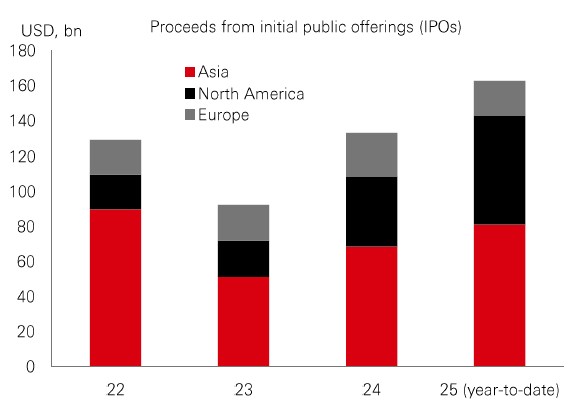 In early 2025, many investors were unconvinced about the outlook for Asian stocks this year. Nearly 12 months on, the region has not only delivered a rip-roaring performance, but it’s also seeing a surge in new company listings. In terms of money raised, Asia’s market for initial public offerings (IPOs) has been a world-beater, with USD81 billion raised year-to-date. That’s already an increase of nearly 60% on 2023. Industry data suggest that Q3 was particularly strong for IPOs, given fading tariff concerns and Fed rate cuts. Hong Kong, in particular, has reclaimed its position as a major hub for new listings, helped by supportive policy on dual-listings and fast track channels to attract tech firms. Mainland China’s onshore market has also thrived, and so have other ASEAN hubs. India also stands out, where there has been a boom in new listings across sectors, and strong retail demand. |