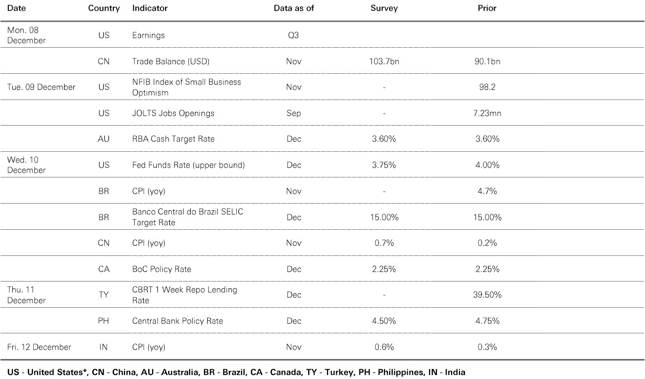 Source: HSBC Asset Management. Data as at 7.30am UK time 05 December 2025. For informational purposes only and should not be construed as a recommendation to invest in the specific country, product, strategy, sector or security. Any views expressed were held at the time of preparation and are subject to change without notice. Any forecast, projection or target where provided is indicative only and is not guaranteed in any way. *The US government shutdown has ended, but there may still be delays to the expected releases of official data.