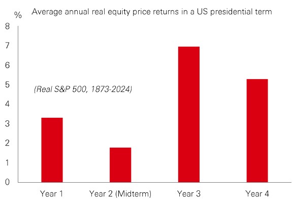 Historically, the second year of a US presidential term tends to be a tricky one for markets. It’s often the weakest year for real stock returns in the S&P 500, thanks to the uncertainty that midterm elections bring. Investors don’t like surprises; unexpected policy shifts and questions about the economic outlook often weigh on risk appetite during this period. We also know that almost every midterm election has resulted in the incumbent president's party losing seats in the House of Representatives. If Republicans lose their slim House majority this year, it could result in a Republican president and a Democrat-controlled House: a political gridlock scenario. The good news is that markets often welcome this. A divided government means a lower chance of large policy changes, which tends to calm volatility and boost stocks post-election. |