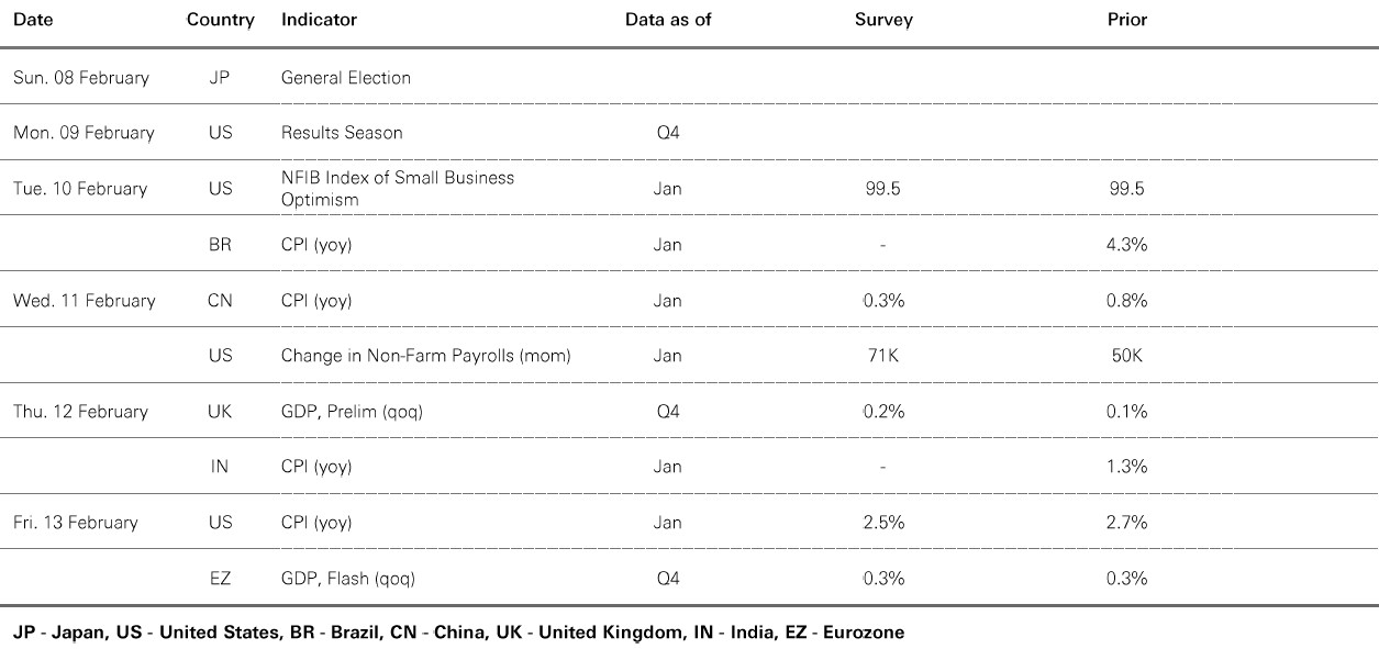 Global equities were mixed as persistent concerns about AI disruption and returns from AI capex fuelled a further rotation away from US technology stocks—with the S&P 500 and Nasdaq indices on course to close the week lower. By contrast, the equal-weighted S&P 500, the Euro Stoxx 50, and the FTSE 100 all touched record highs, reflecting ongoing broadening out to non-tech and value sectors and regions. In Asia, Chinese stocks fell, but Indian indices rallied on news of a US-India trade deal. Kospi experienced choppy sessions and traded lower, while Nikkei 225 advanced ahead of the general election. In commodities, gold and silver fell in volatile trading, alongside a decline in oil prices, as the US dollar strengthened against major currencies. 10-year US Treasury yields fell following soft labour market data.