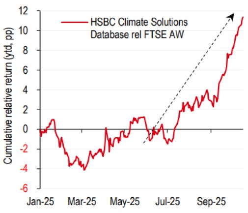 • Global climate stocks have outpaced global equities (FTSE All World) by over 11 percentage points year-to-date (as of 16 October 2025)
