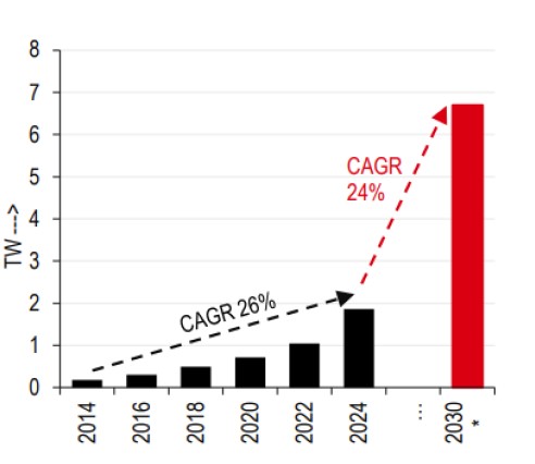 Global renewable energy pledges and policies are driving the growth of renewables and solar power. These include plans to triple renewable energy generation capacity to at least 11TW by 2030 (COP28); end a reliance on fossil fuels (REPowerEU); mobilize USD1trn in solar energy investments by 2030 (International Solar Alliance), and numerous supportive national policies and targets set by countries such as China, India, UAE, South Africa and Brazil. Furthermore, to align with the IEA[@why-esg-matters-04-06] net-zero scenario, solar generation needs to reach approximately 9,200TWh by 2030, requiring an annual average growth rate of around 28% from 2024 levels.