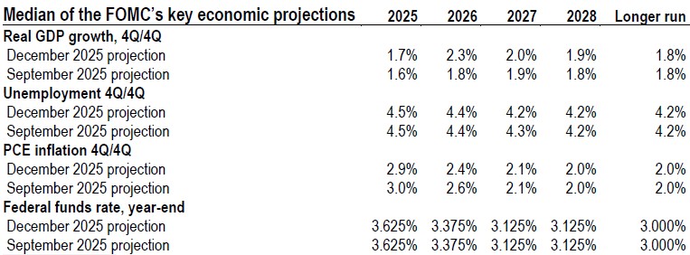 As anticipated, the Federal Open Market Committee (FOMC) implemented a third consecutive 25bp rate cut at its 9-10 December meeting, lowering the federal funds target range to 3.50-3.75%. The decision passed by a 9-3 vote, with dissent from two regional Fed presidents − Austan Goolsbee (Chicago) and Jeff Schmid (Kansas City) − who preferred to maintain current rates, and Governor Stephen Miran, who advocated for a larger 50bp cut.