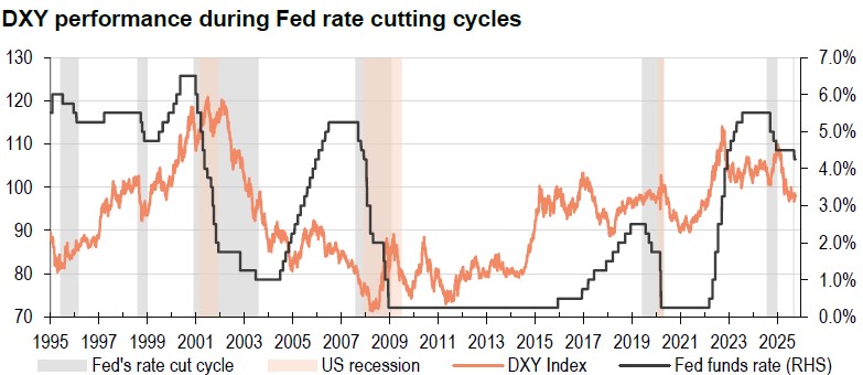 Markets are debating whether the USD has bottomed and is ready to begin an upward trajectory. We believe there is still room for the USD to fall gradually before bottoming out early next year, particularly given potential rate cuts by the Federal Reserve (Fed). Historical instances of Fed rate cuts without accompanying U.S. recessions (namely, 2002-03, 2H07, and 2H19) have typically resulted in a weaker USD (see chart below), offering insights into the current situation. In addition, US trade policy uncertainty and Fed independence could also weigh on the USD.