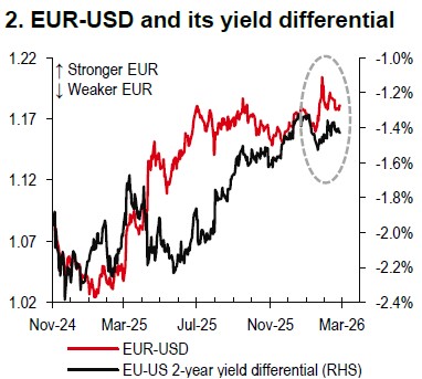 EUR-USD has held steady despite ongoing EU-US trade uncertainty. The EU is likely to postpone ratification of the trade agreement as legislators seek further clarity on US trade policy (Bloomberg, 24 February). With EUR-USD trading above interest rate differentials (Chart 2), most US policy risk seems priced in. Over the near term, we expect EUR-USD to move towards the upper end of its current range, though significant new highs are unlikely. In the Eurozone, fiscal expansion and production recovery offer some upside, but a strong EUR rally would require robust wage growth or a clear credit cycle. The European Central Bank’s (ECB) influence remains limited, with no rate changes expected in 2026 (Bloomberg, 24 February).