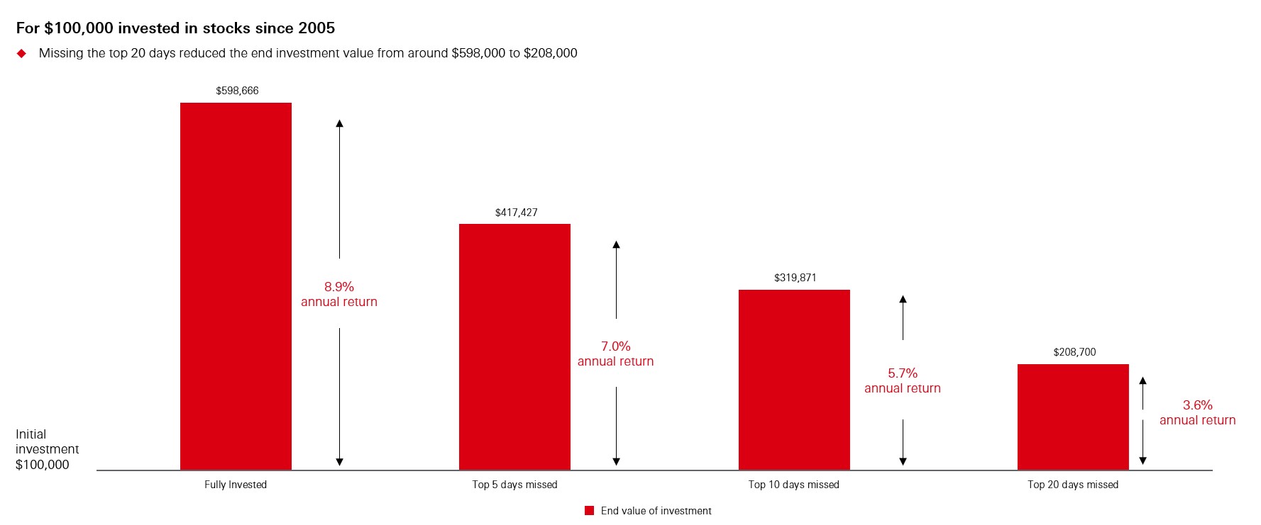 Moreover, in trying to time the market, you run the risk of missing out on some of the best performing days. Even missing just a few of those best performing days can result in a big difference in your return.