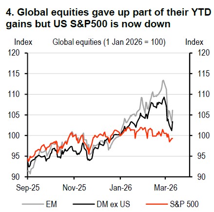 Little more than a week before the Iran conflict began, the US Supreme Court had ruled that the Trump administration’s use of emergency powers (IEEPA) to impose tariffs on US imports was illegal. The Trump administration responded by imposing a 10% global tariff (which officials have said would be increased to 15%), benefitting some large emerging market (EM) regions, including Brazil, mainland China and Indonesia, and hitting Europe relatively harder.
