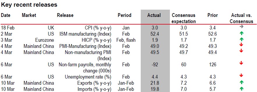 The conflict started at a time when the recent hard data had been quite solid. Global manufacturing and services PMIs (and particularly the US services ISM) increased in February even as the US labour market data continues to paint a mixed picture. January’s upside surprise in payrolls (+126k) was followed by a large drop in February (-92k) but jobless claims are low. Globally, inflation was little changed, although core inflation was up to 2.4% in the Eurozone in February and US core Personal Consumption Expenditures (PCE) was 3% in December.